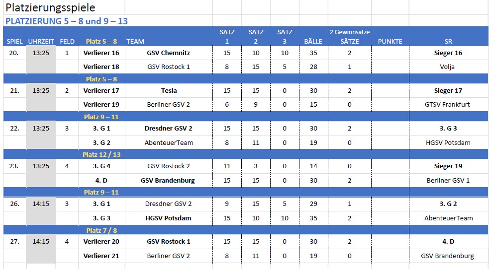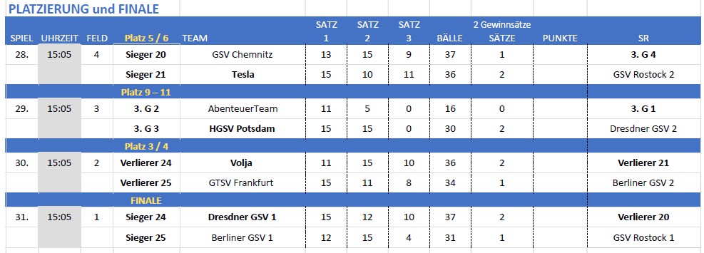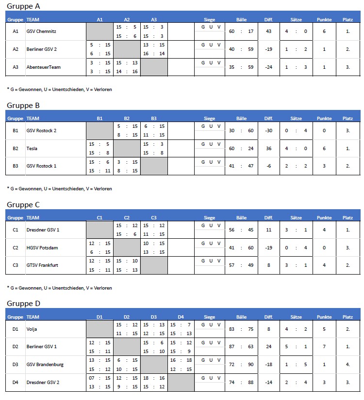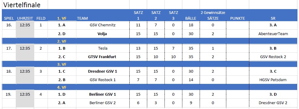 Wir von Dresden hatten das 1. Spiel gegen Potsdam, hier haben wir 2-0 gewonnen. Potsdam hat aber mit den Schülern sehr gut mitgehalten und uns immer wieder überrascht. Gegen Frankfurt war es schon schwieriger, da spielten wir nur 1-1 nach Sätzen und haben mit 1 Punkt weniger das Direkte Duell verloren. In der Gruppe zählten aber die kleinen Punkte mehr, da hatten wir mehr als Frankfurt und waren dadurch trotzdem Gruppenerster. Nur spielten wir gegen den 2. Platz aus Gruppe B, Rostock1.
