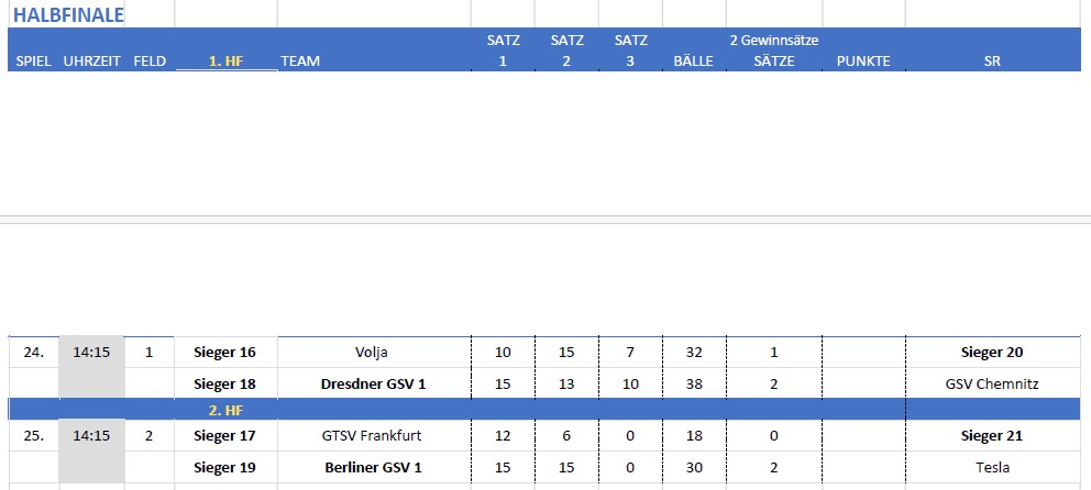Mit Rostock haben wir eine sehr gute Volleyballfreundschaft aufgebaut und wir freuen uns immer sehr herzlich wenn wir uns sehen. Die Rostocker haben leider über 2h im Stau gestanden und ich hatte das Gefühl sie waren noch nicht so richtig da, bzw. der Tagesablauf war dadurch stark gestört. Rostock hatte in diesem Spiel keine Chance und verloren gegen Dresden1 mit 0-2 (7:15/7:15). Jetzt musste Dresden gegen Volja spielen. Für mich eine Mannschaft mit Chance auf den 1.Platz und zu recht in Halbfinale. Dresden spielte sehr konzentriert und konnte Satz 1 gewinnen. Im 2.Satz war Volja aggressiver, machte selbst wenig Fehler und Dresden wurde etwas unsicher in ihren Aktionen. Dresden lag zurück, konnte sich aber wieder bis auf 1 Punkt rann kämpfen. Das hat lieder nicht gereicht, den Volja konnte noch den Vorsprung halten und damit stand es 1-1. Der Tie-break muss nun entscheiden. Dresden war jetzt nun wieder klarer und konnte beim Stand von 5-1 die Seiten ein letztes mal wechseln. Die 4 Punkte Vorsprung haben gereicht damit Dresden 10-7 gewinnt und damit im Finale stand. Wow, wir haben schon jetzt toll gefeiert und uns gefreut, Finale ist doch unglaublich. Jetzt mussten wir gegen das starke Berlin 1 mit Heimvorteil spielen.