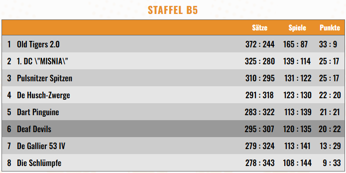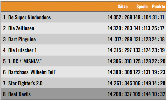 Der 1. Platzierte Team Dresdner Dart Löwen musste wegen 2 Spieler, die das Team verlassen wird, auf Aufstieg in B Klasse verzichten.