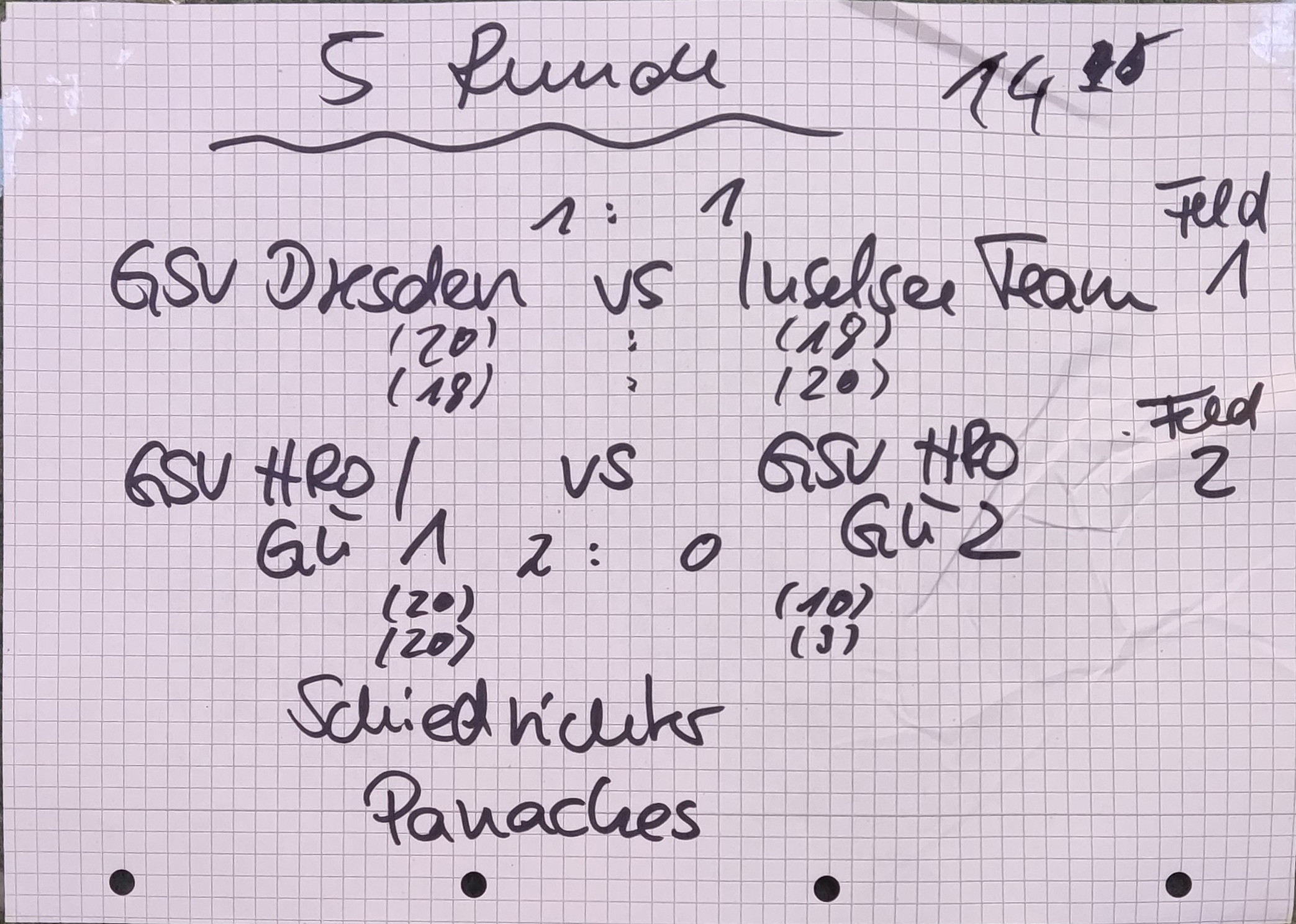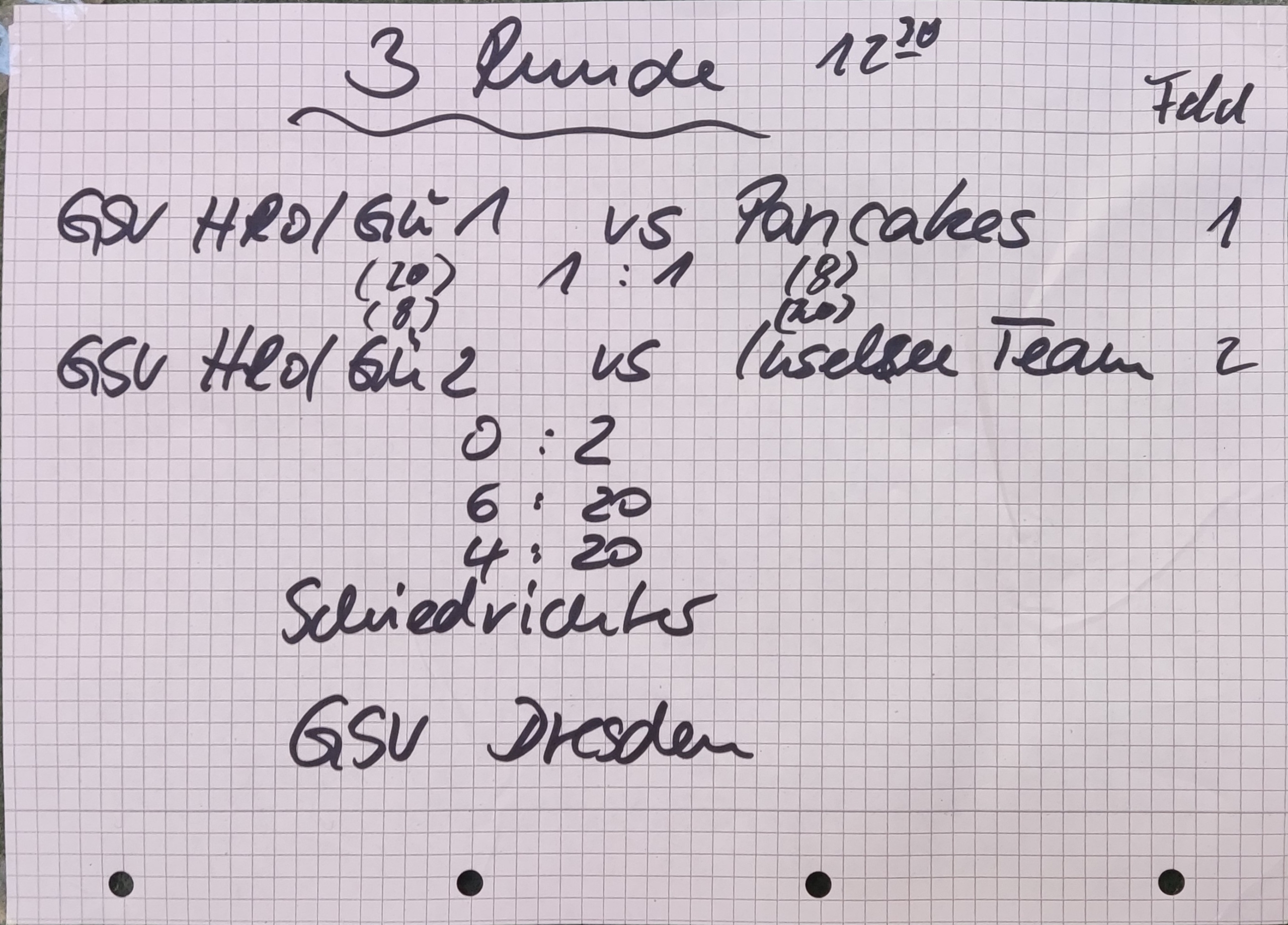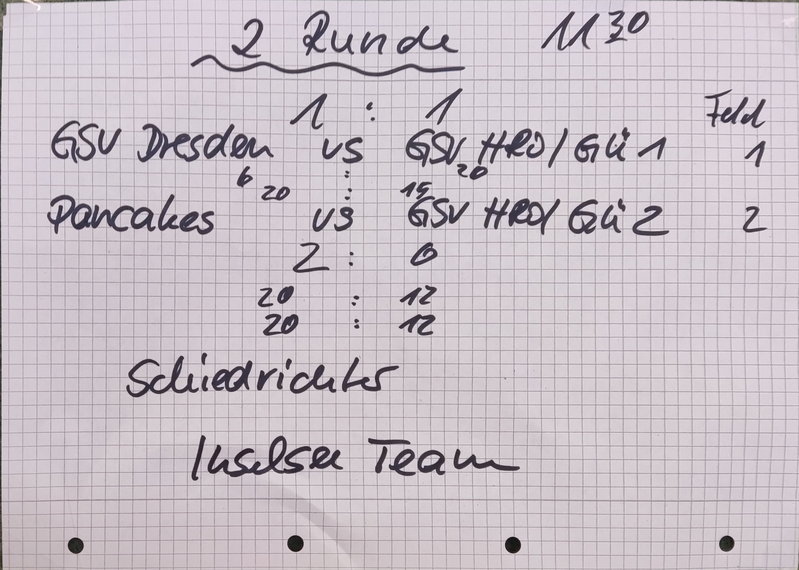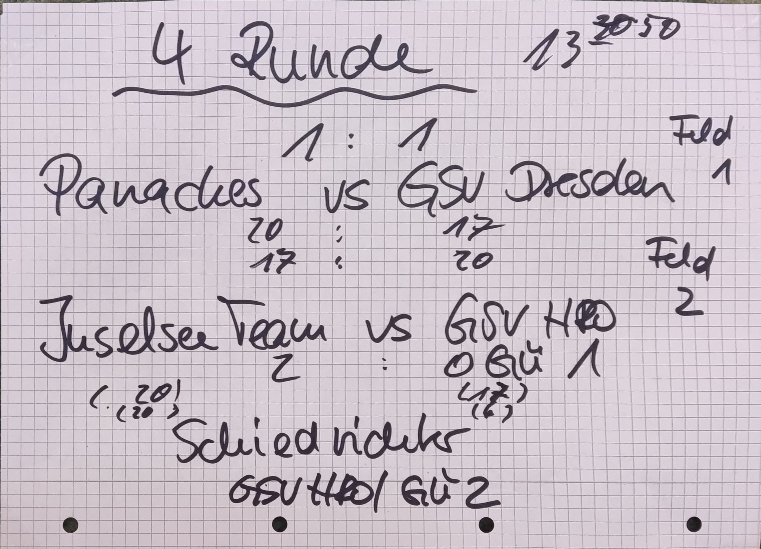 Im dritten Spiel mussten wir gegen Inselsee Team (Hörend) spielen. Es war ein Spannendes Spiel. Das Erste Satzspiel gewannen wir GSV Dresden mit 20:18. Im zweiten Satzspiel gewann die Inselsee Team mit 20:18. Gleiche Satzspiel wie im ersten! Somit haben wir unentschieden gespielt.